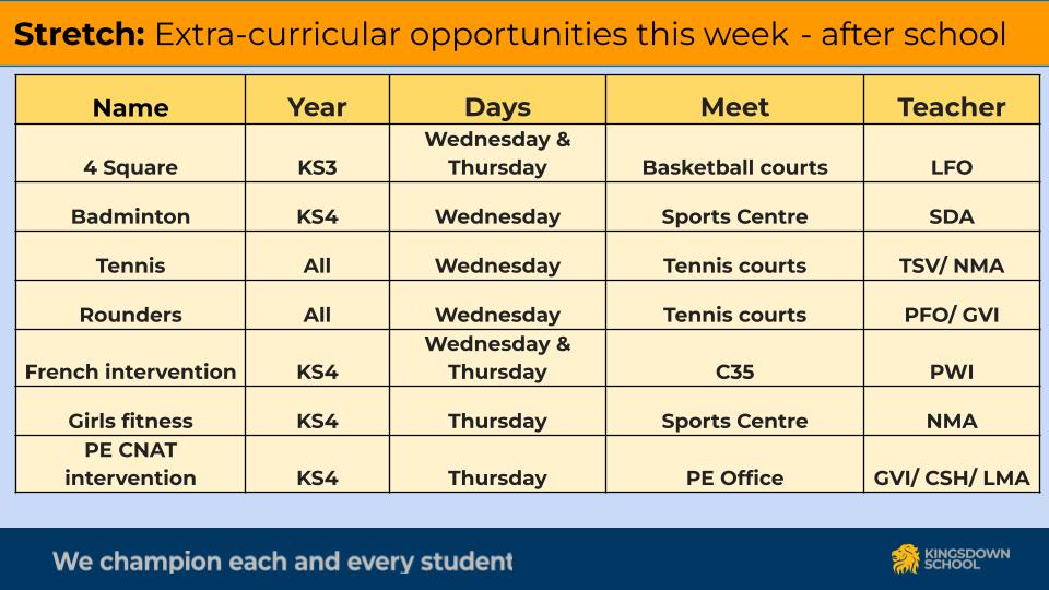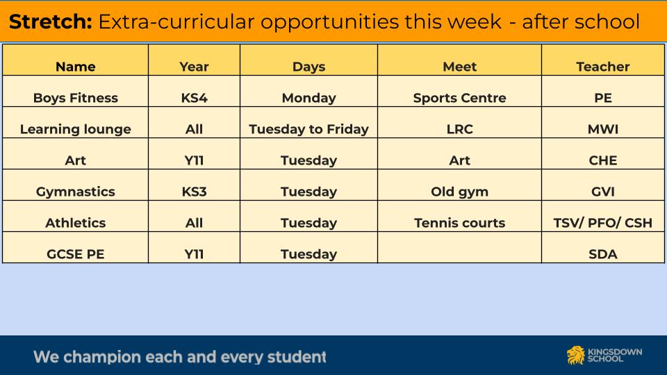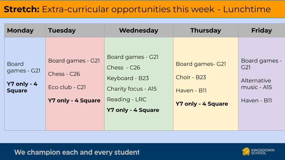 Orchestra, Choir, Chamber Choir, Ensemble, Keyboard Club, Drama, Netball, Football, Basketball, Fitness, Hockey, Dance, Art Textiles, Art, Chess.