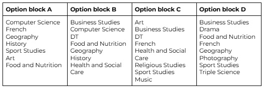 The subject choices for KS4 study for examinations to be taken in 2026 are as follows: